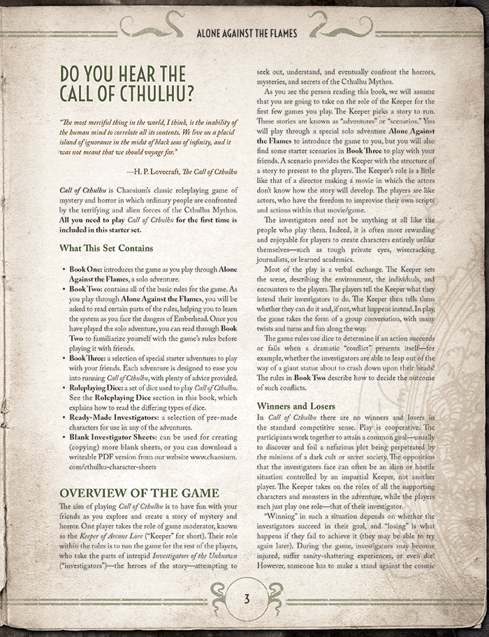 The Call of Cthulhu Starter Set contains everything needed to play Chaosium’s classic horror RPG, updated for the 40th anniversary with new art.